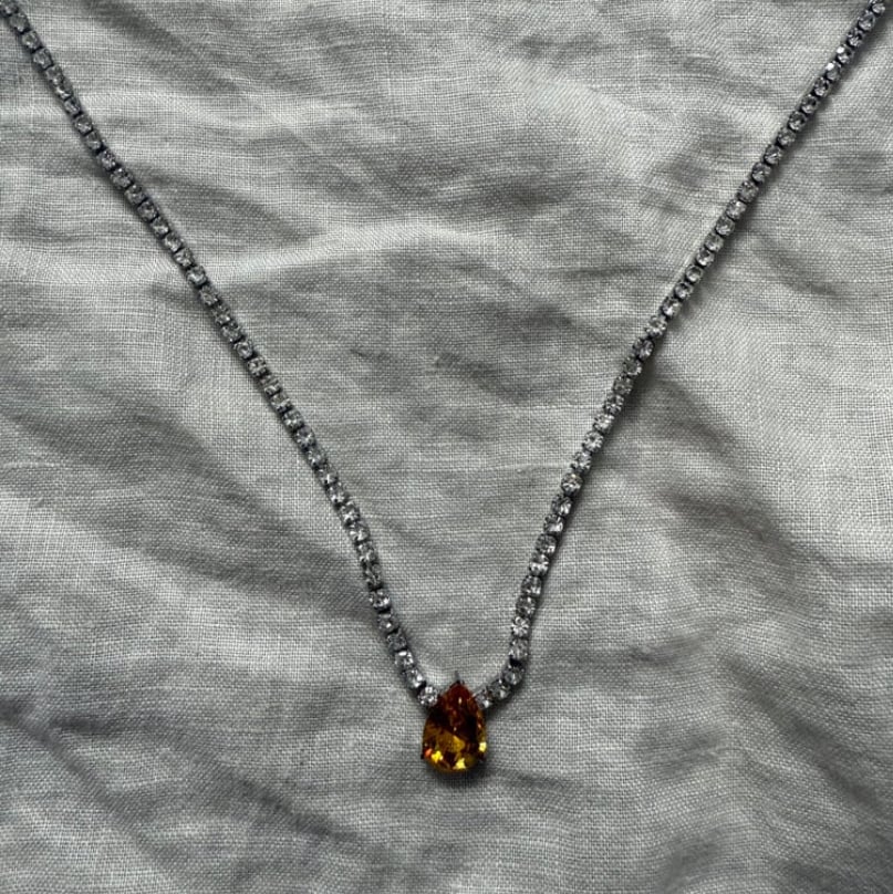 Radiant and refined, the Solara Glow Necklace is your go-to piece for statement sparkle with a diamond twist. Featuring a brilliant pear-cut amber gemstone suspended on a classic tennis chain, this piece catches the light and attention wherever you go.